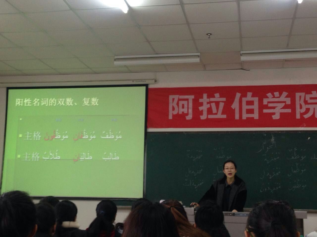 第二堂课由独乐老师和何祯老师主讲,时间是上午第三小节课,地点在贺兰山校区文科楼112教室,主讲课程是基础阿语Ⅰ。在课堂上,独乐老师的授课内容重点突出,讲课条理清晰,讲授内容逻辑性强、知识点规律明了易懂。何祯老师通过多媒体课件,对课前由同学们提出的知识点难点进行讲解和补充,课上师生互动积极,教风活泼、灵活,极大地带动了课堂氛围。