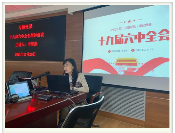 李海燕书记从“十九届六中全会召开的重大意义、中国共产党百年奋斗的历程、中国共产党百年奋斗宝贵经验”三个方面展开,深入阐述了十九届六中全会的主要精神、核心要义和丰富内涵。她指出,要坚持学史与鉴今相统一、历史与现实相贯通、传承与创新相融合、理论和实际相结合、立说与立行相统筹,将十九届六中全会精神内化于心,外化于行。