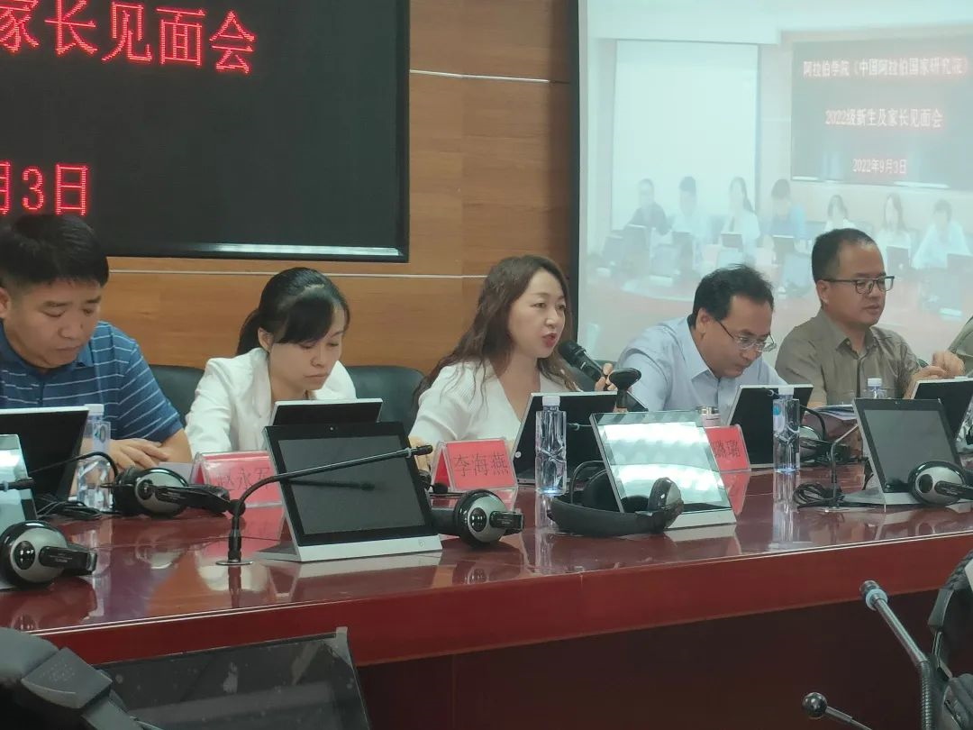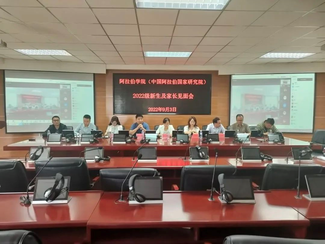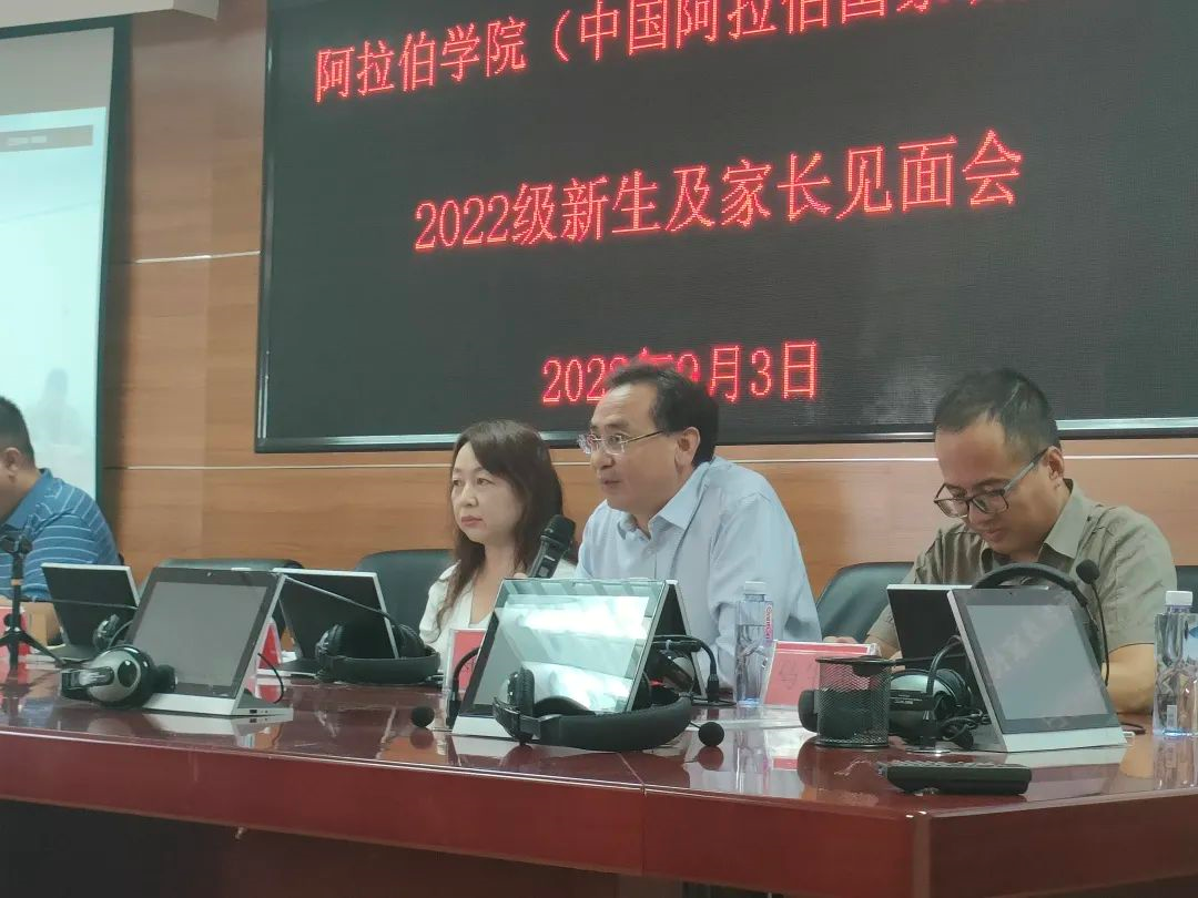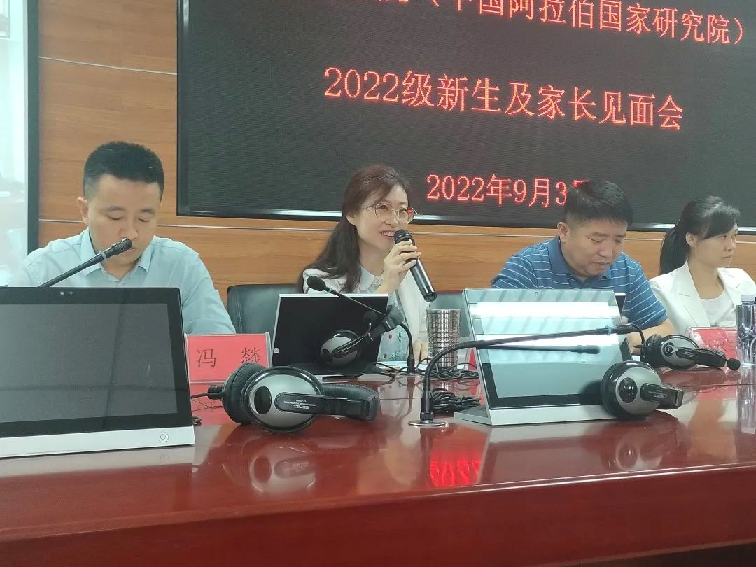 白楠副院长从学院历史沿革、人才培养方向、国际合作交流、教学管理等方面进行了介绍,重点对新生的专业学习中应注意事项进行了强调;冯璐璐副院长介绍了中国阿拉伯国家研究院的发展历程与高端智库、平台建设情况;金忠杰副院长介绍了学院科研、专业、研究生教学情况;学办主任金宁洋讲解了学院目前学生静默期管理注意事项;班主任冯燚、梁道远博士进行了交流发言,两位班主任都对新生和家长们表达了欢迎和感谢,并结合个人求学经历帮助新生们尽快融入大学生活;学生代表 2019级罗源同学结合学习、工作等情况勉励学弟学妹们要学会感恩,珍惜时间,奋发有为;赵永军副书记结合疫情防控纪律、一日作息管理制度、访学、就业等方面,要求新生家长做好与学院、学生的定期沟通;希望各位新生提高安全防范意识,做好学业规划,扣好大学第一粒扣子。