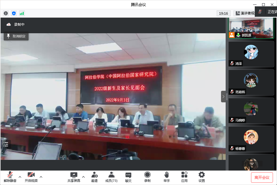 (中国阿拉伯国家研究院)采用腾讯会议的形式召开“2022级新生及家长见面会”。学院党总支书记李海燕、副书记赵永军、副院长白楠、冯璐璐、金忠杰、马生忠、冯燚、学生办公室主任金宁洋、新生班主任梁道远在学院学术报告厅,2022级新生及家长通过线上参加见面会。本次见面会由赵永军副书记主持。