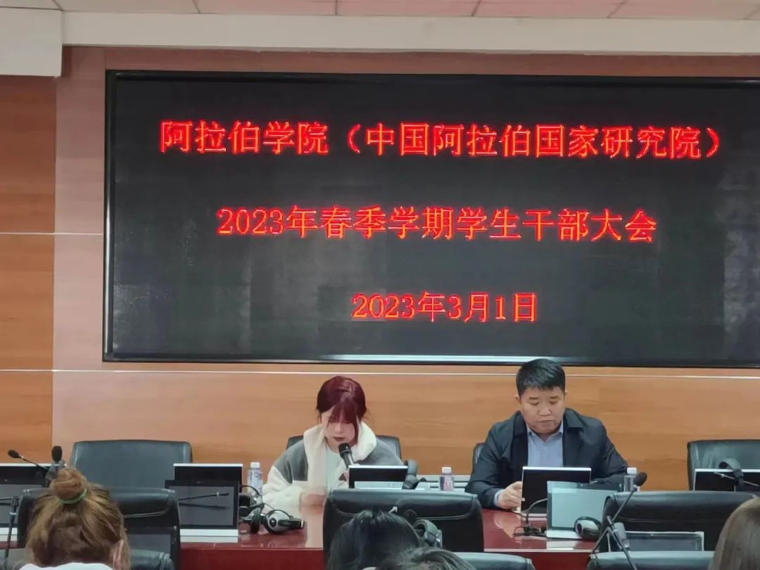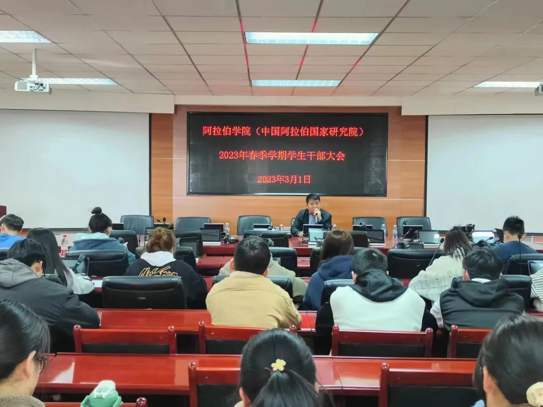 (中国阿拉伯国家研究院)于知行楼八楼报告厅举行2023年春季学期学生干部大会。党总支副书记赵永军、学院全体学生干部参加会议。会议由赵永军书记主持。