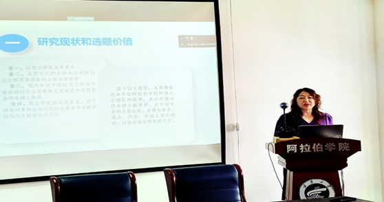 在项目组汇报阶段,项目首席专家冯璐璐教授从本课题的研究现状和选题价值、总体框架和主要内容、研究思路和研究方法、重点难点和创新之处以及研究团队等5个方面进行了汇报。同时,向大会分别介绍了本项目的团队及主要负责人。“阿拉伯文明西传的路径与影响研究”项目共计包括4个子项目,冯璐璐教授还着重介绍了她本人负责的子项目四“阿拉伯文明西传的意义及影响研究”的研究框架。