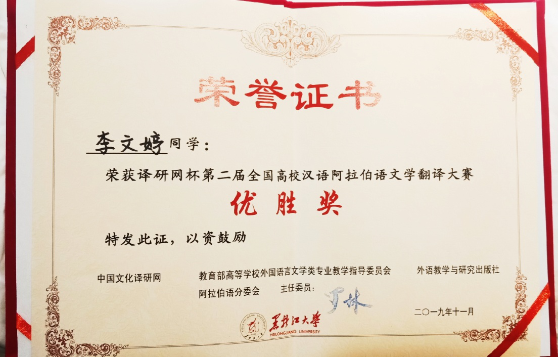李文婷同学获得大赛决赛的参赛资格,于2019年11月2日在黑龙江大学参加“译研网第二届全国高校汉语阿拉伯语文学翻译大赛”决赛,并在决赛中获得全国优胜奖。