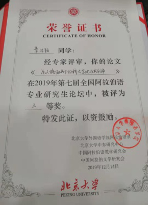 研究生章洁颖的论文《论人格面具下的穆太奈比》荣获三等奖。
